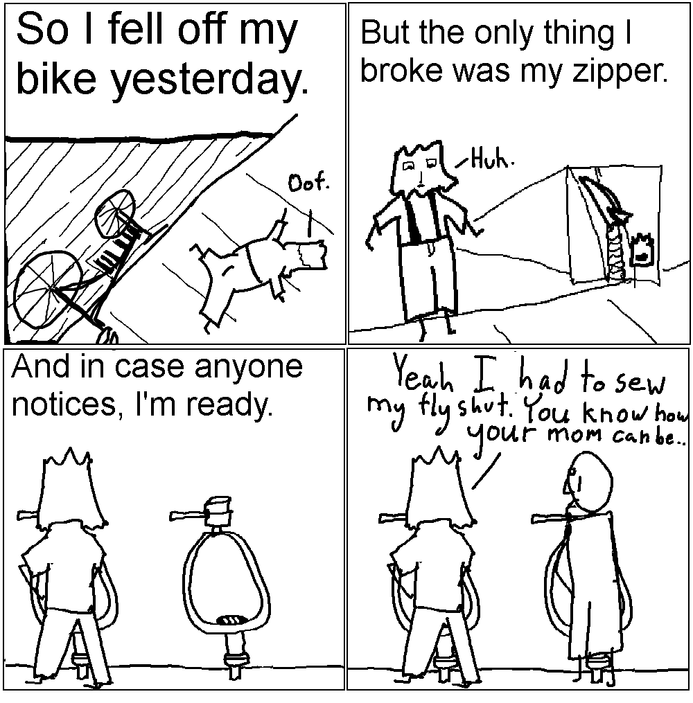 If you're wondering why that bike seat looks weird, it's because my bike seat looks weird. If you're wondering why the other guy, the sidewalk, my zipper, and the urinal looks weird, it's because I devote a lot of my time to drawing, SOMETHING I'M NOT EXACTLY RAD AT.